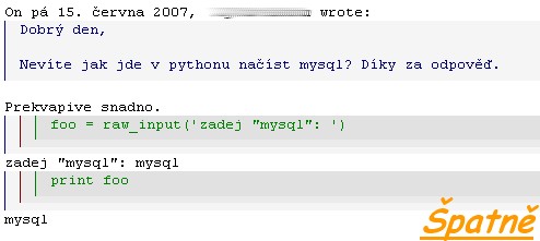 Používáte-li jako klienta pro čtení příspěvků konference Python Thunderbirda, je problém s věrným zobrazováním pythonovského promptu ">>>" v příkladech od přispěvatelů. Prompt je většinou uvozen na začátku. Znak ">" se ale v klientech většinou používá na citace zpráv, tedy když odpovídáte na zprávu, je automaticky původní odpověď odsazena pomocí ">". Thunderbird zobrazuje ">" na začátku řádku jako svislou čáru, pravděpodobně pro lepší čitelnost a přístupnost pro běžné, nepythonýrské uživatele.